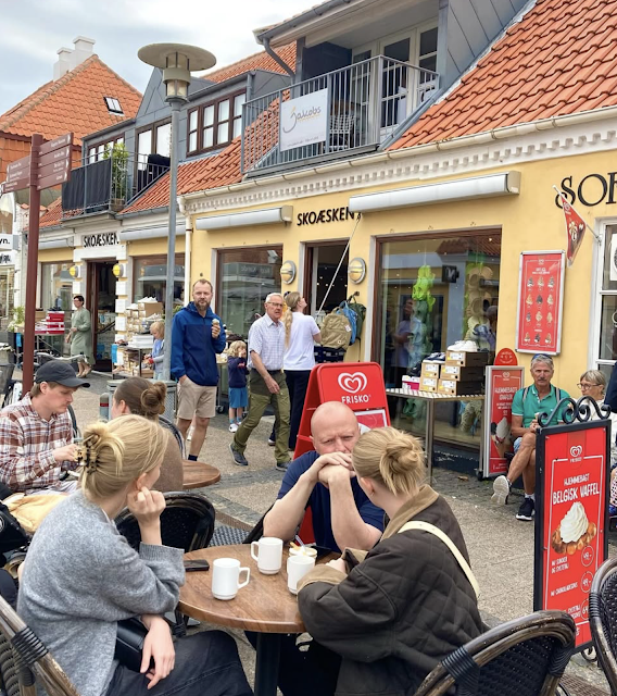 Och det var väldigt mycket folk som fanns på gatorna här, mest turister men också danskar som bodde här permanent eller bara hade ett sommarhus här vid havet. Ni ser några av alla turister här, sittandes vid ett glasscafé som låg längs gågatan mitt i stan.
